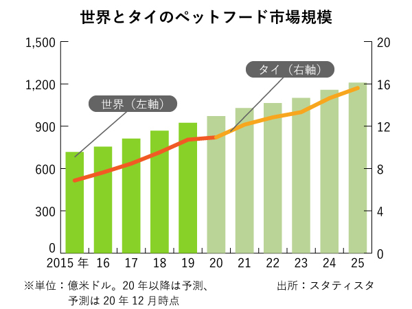 ドイツの調査会社スタティスタのデータでは、2021年の世界とタイのペットフード市場規模は、それぞれ前年比6%増の1,029億米ドル(約10兆7,000億円)、11%増の12億米ドルになると予想される。タイはペットフードの生産国でもあり、20年の輸出額は前年同期比19%増の20億米ドル(タイ商務省)と好調だ。