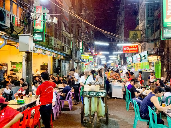 MBLはコロナ禍で販売の落ち込みも見られた。写真はヤンゴンの「バーベキュー・ストリート」=20年2月19日、ヤンゴン(NNA)