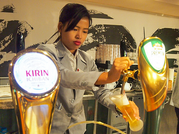 「一番搾り」「ミャンマー・プレミアム」の生ビールが市内のショッピングモールで提供されていた=19年1月、ヤンゴン(NNA)