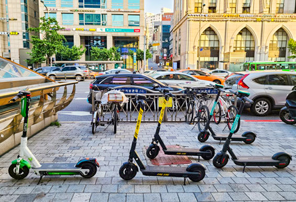 ソウル市内の歩道に停車されている電動キックスケーター=韓国(NNA撮影)