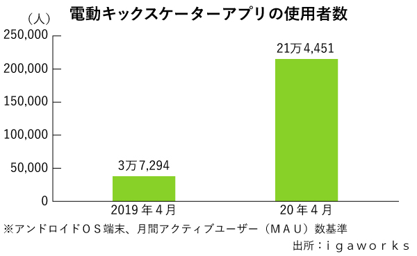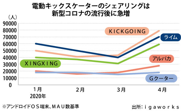 コロナ禍も需要の追い風となった。市場調査会社のigaworksによるとコロナ流行直後の昨年2~3月は、感染への懸念から多数が使うスケーターの利用は減少した。しかし4月以降、感染状況が深刻になるにつれ増加に転じる。地下鉄やバスなど公共交通機関を避け、パーソナルモビリティーを利用する人が増えたためだ。