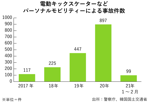 韓国警察庁によると、スケーターを含むパーソナルモビリティーの事故件数は2019年の447件から20年は897件に倍増。負傷者や死亡者数も急増している。昨年10月には、20代の女性が自転車専用道路をスケーターで走行中に歩行者と衝突し、全治6週間の大けがを負わせる事故が発生。裁判所は、当時は認められていなかったスケーターの無免許運転など違法行為があったとして加害者に罰金500万ウォン(約48万5,500円)の支払いを命じた。