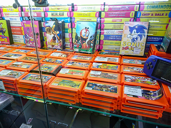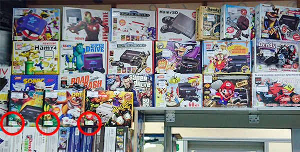 前の写真で天井まで積まれているのは、北アジア(シベリア)や極東アジアで売られているレトロ風のゲーム機です。このゲーム機はロシア政府による年齢別レーティングがしっかりと行われているのですが、ふたを開けて確認してもらうと中には日本の「ファミリーコンピューター」や「メガドライブ」のようなレトロゲーム機のクローン(模造品)が入っていました。