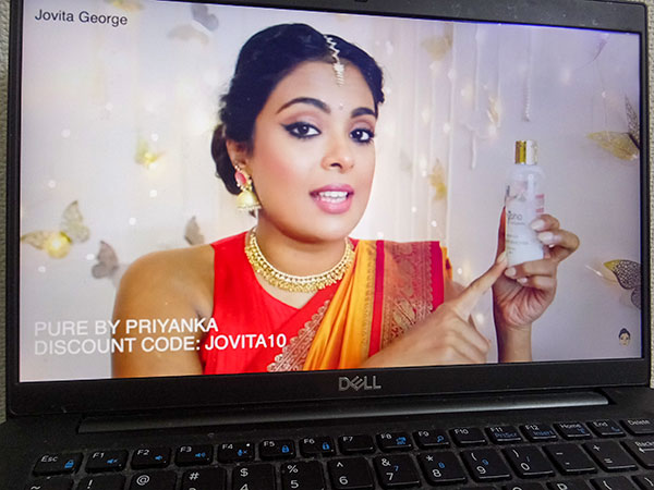 チェンナイ在住のバーラティさんがフォローしているインドの美容系ユーチューバー、ジョビータ・ジョージさん。自身が選んだ2020年のスキンケア商品ベストテンの動画で、韓国のピュリトとシークレットキーの商品を紹介している(NNA撮影)