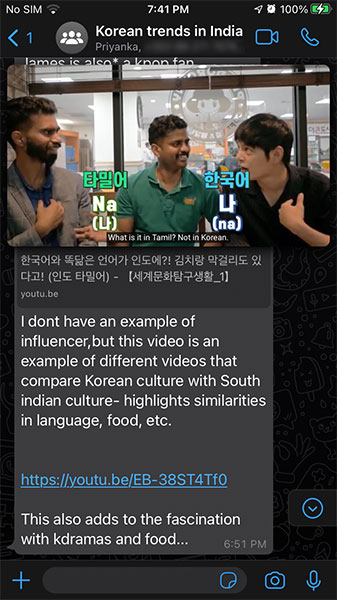 グループチャットで共有された、韓国語とタミル語(インド南部タミルナド州の公用語)の共通点を取り上げた動画。インドの韓流ファンは、韓国語とタミル語の共通点や、韓国料理と南インド料理の共通点を見つけることが楽しみのひとつだという(NNA撮影)