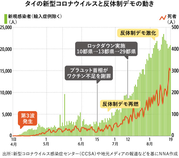 ワクチンに関しては、王室が出資する製薬会社サイアム・バイオサイエンスが英アストラゼネカ製ワクチンの独占生産権を獲得しながら生産が遅れたことや、中国の科興控股生物技術(シノバック・バイオテック)製品の調達を巡り、タイの最大財閥チャロン・ポカパン(CP)グループと政府との癒着が報じられた。さらに、富裕層が優先接種を受けているとの報道もあり、従来の経済的・社会的格差があらわになりつつある。