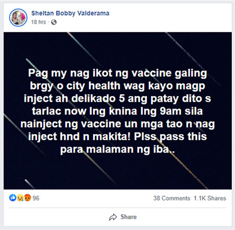 〈デマその1:フィリピン〉 「フィリピンのタルラック市で、5人がワクチン接種を受けたあとに死亡した」