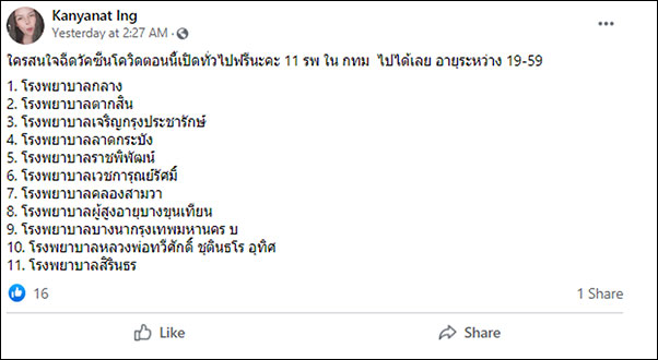 「19~59歳の人であれば無料でワクチン接種できる」とする投稿と、対象の11の病院が具体的に挙げられた投稿がフェイスブックに載り、タイでシェアの高いLINEで拡散されました。これ自体はワクチン接種を忌避させるものではありませんが、拡散させる意味がよく分からない虚偽情報もこのように広まってしまうケースがあるという見本です。