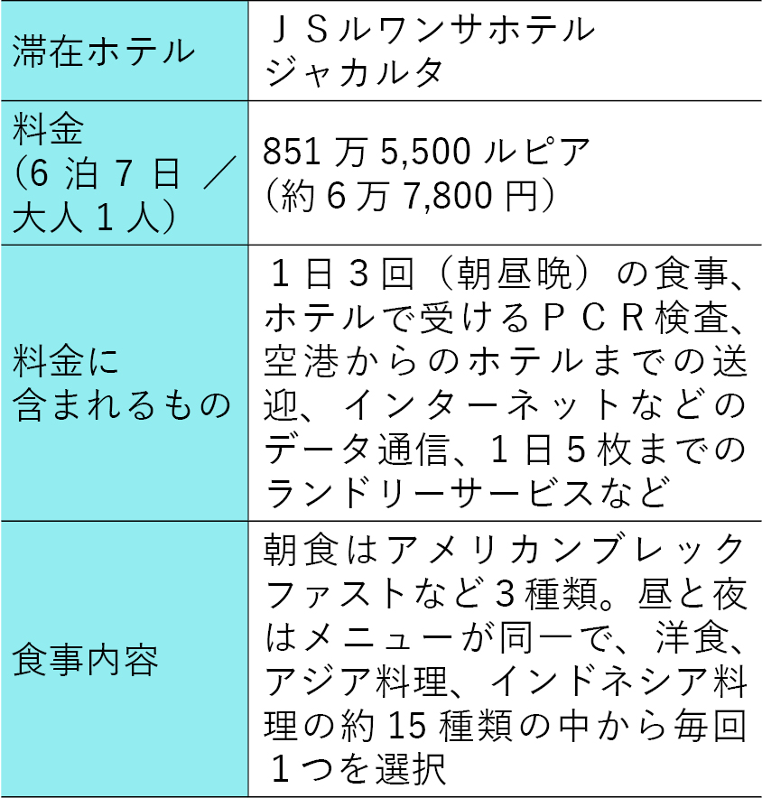 宿泊先は、政府指定の隔離ホテルの中から、利便性の良さを基準に南ジャカルタ市の4つ星ホテル「JSルワンサホテル ジャカルタ」を選択。このホテルで一番安かった6泊7日で851万5,500ルピア(約6万7,800円)のプランを利用した。