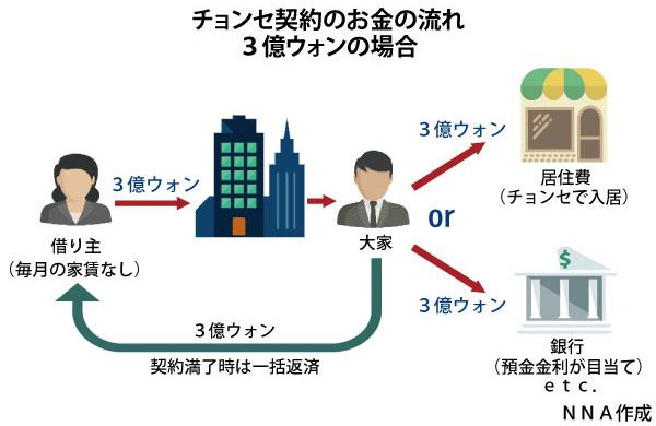 例えば、チョンセ3億ウォンの賃貸物件の場合、借り主は入居の際に3億ウォンをまとめて支払う。契約満了で引っ越す際は、3億ウォンを全額受け取って退去する。大家はこの3億ウォンを銀行に預けたり、自らの居住費に充てたりして、家賃収入の代わりにする。