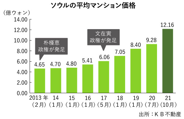 韓国の不動産価格が高止まりする一方、賃金上昇率はこの4年間で1割程度にとどまる。国民所得の成長率と価格上昇率の乖離(かいり)は大きい。医者や弁護士といった専門職でも労働所得だけではソウルのマンションが買えない水準で、貧富の格差を広げる最大の要因になっている。