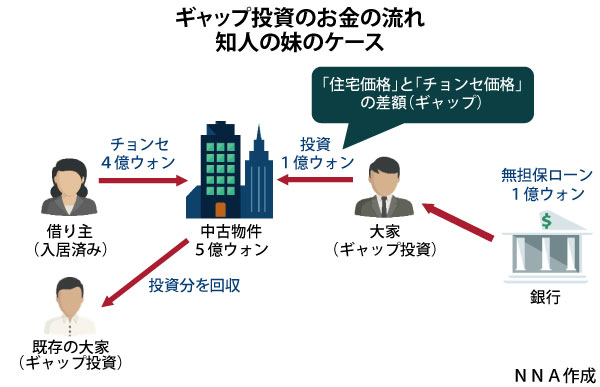 彼女は、借り主が4億ウォンのチョンセで入居している中古物件(販売価格は5億ウォン)に目を付けた。その物件には既に保証金としてチョンセの4億ウォンが入っているため、残りの1億ウォンのみを用意すれば購入することができるという仕組みだ。彼女は貯金が無かったので、銀行から無担保ローン(元本一括返済型)で1億ウォンを借り入れて資金を融通した。利息約33万ウォンを毎月支払うだけで、投資価値のある地域の物件を購入できたわけだ。