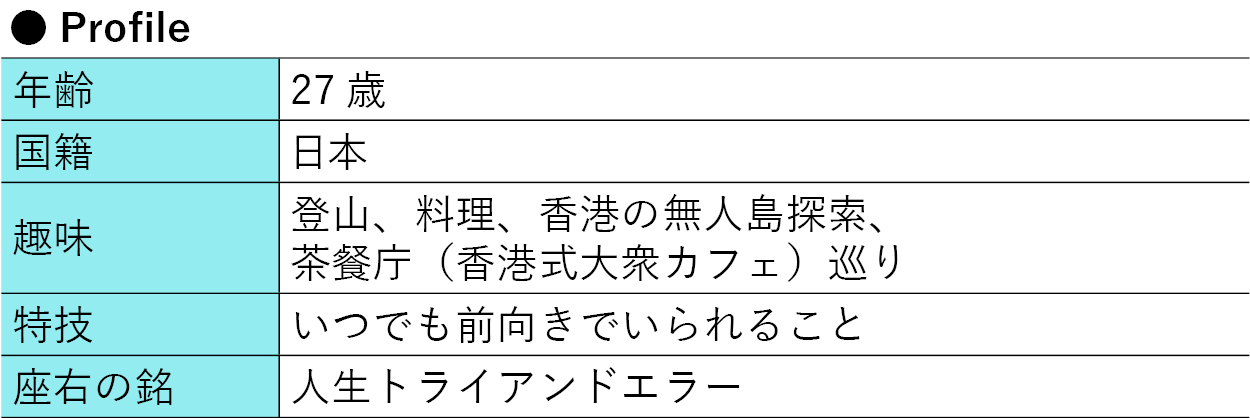 リンモク 街全体からあふれるエネルギーに、利便性の良さ、あとは山や海など自然を楽しめるスポットへのアクセスの良さ。日本の方にはあまり知られていませんが、香港には自然豊かな場所がたくさんあり、ハイキング好きな自分には理想的。でも、一番好きなのは香港人の生き方。自分の人生は失敗続きだったので、香港人の「失敗しても諦めずまた頑張ろう」という信念の強さに憧れますし、自分もそうなれるよう今後も学ばせていただくつもりです。