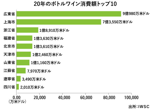 省・自治区・直轄市別で見たボトルワインの消費金額は、広東省を筆頭に上海市、浙江省など沿海部の省・市が上位に。いずれも経済規模が大きく、中でも広東省は香港に近いこともワイン消費を押し上げる要因のようだ。
