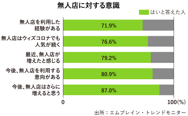 市場調査会社のエムブレイン・トレンドフォースが、2021年12月に実施したオンラインアンケート(満19~59歳の男女1,000人を対象)では、「最近、無人店が増えたと感じる」と答えた人は全体の79.2%、「無人店を利用した経験がある」と答えた人は71.9%を占めた。「今後、無人店を利用する意向がある」という回答も80.9%に上った。