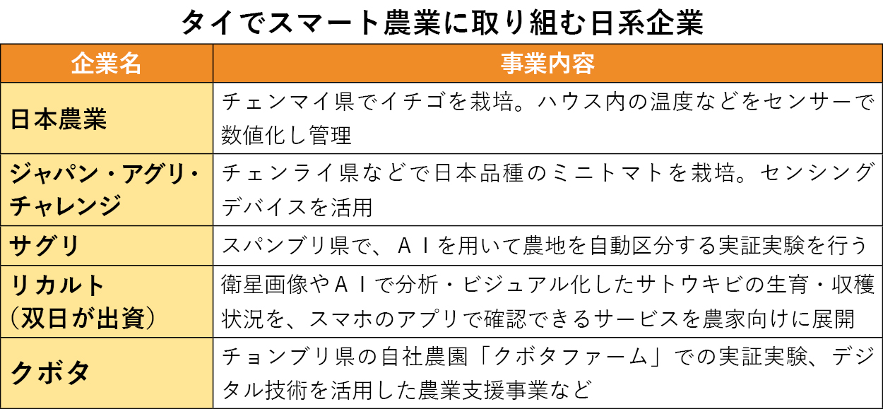 タイで農業のスマート化に向けた取り組みが始まっている。タイは農業が労働人口の約30%を占めるものの、国内総生産(GDP)に占める割合は8%ほど。鍵となるのは生産性の向上だ。日系企業もスタートアップを中心に、情報通信技術(ICT)を活用した農業のスマート化に向けた取り組みが増えており、成果も上がっている。地元の農家や消費者の間でも好評だ。(NNAタイ副編集長 坂部哲生)
