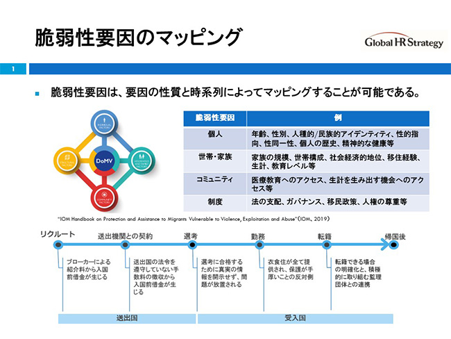 外国人労働者が弱い立場に立ってしまう要因は多岐にわたります。国際移住機関(IMO)は「脆弱性要因」と定義し、要因の性質と時系列によってマッピング(図示)できるとしています。日本でも、言葉の障壁や「相談できるコミュニティーにつながれない」「制度上の問題で転職ができない」といったことから、実習生への人権侵害が深刻化しやすいといえます。最近では、岡山市の建設会社でベトナム人実習生が約2年間も暴行を受けていたと大きなニュースになりました。