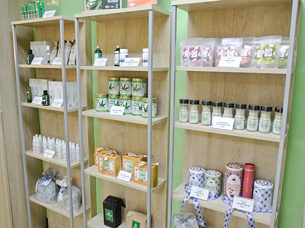 ヘンプを使ったチョコボールやグミなど食品の販売も=5月3日、バンコク(NNA撮影)