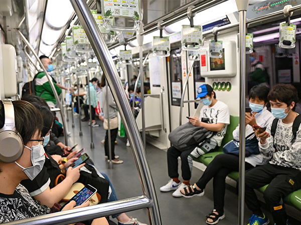 朝の通勤ラッシュ時の地下鉄車内には、マスク姿で職場に向かう通勤客らの姿が戻った=6月1日、中国・上海市