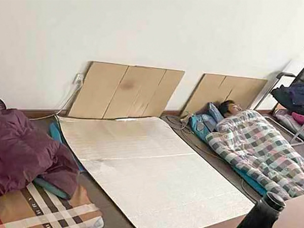 ロックダウンによる生産の遅れを取り戻すため、工場の空きスペースに寝具を並べて雑魚寝する従業員=中国・上海市(上海援維汽車配件提供)