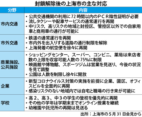 中国上海市のロックダウン(都市封鎖)が6月1日朝、事実上解除された。上海市は、新型コロナウイルスの感染拡大を受け、3月末から順次ロックダウンを導入。それから約2カ月、市内の地下鉄駅にはマスク姿で職場に向かう通勤客らの姿が戻った。出社した会社員からは業務の効率化につながると歓迎する声が聞かれたが、感染を警戒しながらの経済活動の再開に懸念と不安を示す日系関係者も。封鎖明け直後の市内の様子を中心に、「ゼロコロナ政策」の日常を追った。(NNA上海 吉野あかね、吉田峻輔)
