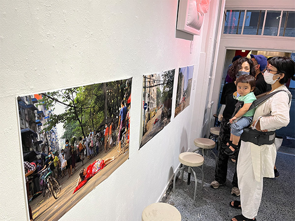 バリケードが残るミャンマーの路上に、真っ赤な衣装を着て横たわる女性を描いた作品のタイトルは「よく眠れる場所はどこですか?」。突然ドアをたたかれ逮捕されることを恐れる夜が続くという、現実へのアンチテーゼだ。唐突に奪われた権利の回復を求め3本指を掲げる民衆と、対峙(たいじ)する国軍の兵士の姿を切り取った写真は、映り込む全ての人の顔が赤く塗りつぶされていた。