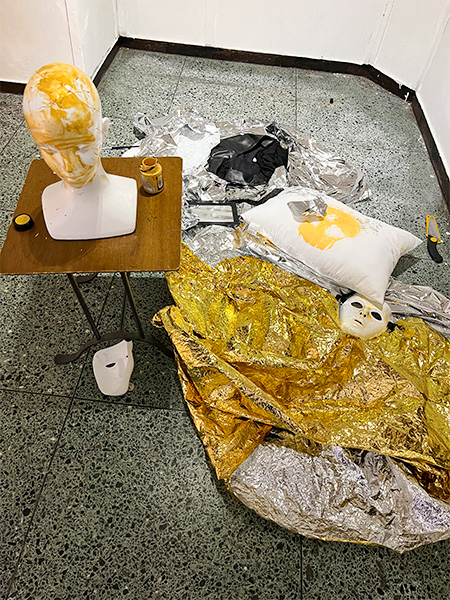 6月11日、福岡市博多区の「アートスペース テトラ」にしつらえられた舞台。純金のシートにくるまり眠っていた女性が次第に顔をしかめ始める。目覚めると、苦渋に満ちた表情で起き上がり、無表情で真っ黒のインクを塗りたくった顔を枕に押し当てた。枕の下で上げるくぐもった叫び声が静まりかえった会場に響く。