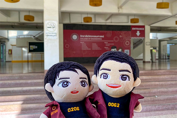 ドラマの主人公カップルを模した人形を入れて、ロケ地のランシット大学で記念撮影。人形は俳優の所属事務所から販売されている公式グッズで、多くのファンが所有しているという=7月16日、パトゥムタニ県(KristSingto JapanFC提供)