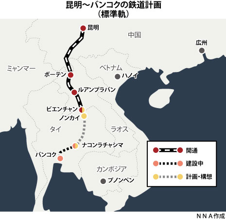 ビエンチャンから中国・雲南省昆明市までを結ぶ全長約1,000キロメートル。このうち、ラオスの区間はビエンチャン―中国国境のボーテンまで、約422キロとなる。ビエンチャンからボーテンへの所要時間は、これまではバスなどを利用して1日がかりの行程だった。それが鉄道の開通で3時間半に短縮された。