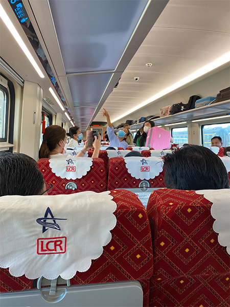 ホームには、既に「中国鉄道CR200J型」の車両が入線していた。号車番号を見て乗り込むと、多くの客が指定座席の座り方に戸惑っている様子で、なかなか前に進まない。目新しさから、あちこちで写真を撮ったり談笑し合ったり、しばしお祭り騒ぎのようだった。