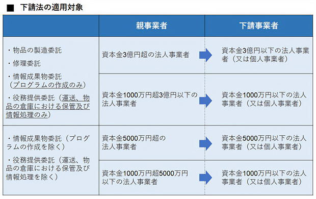 そもそも下請法は、どのような場合に適用されるのでしょうか。その適用対象は「①取引の内容」「②取引当事者の資本金の額」の両面から明確に定められています。