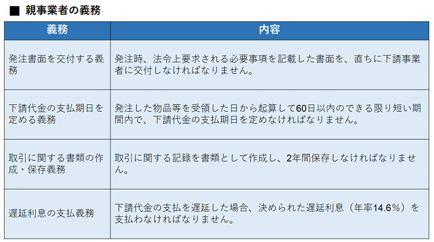 まず、親事業者は以下の表のとおり4つの義務を負います。いずれの義務も重要ですが、ここでは指導件数が多い「発注書面を交付する義務」と、うっかり違反する恐れがある「下請代金の支払期日を定める義務」を取り上げます。