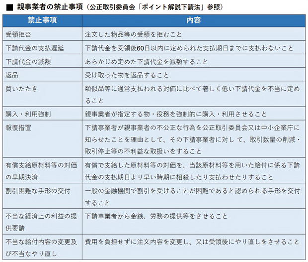 次に、禁止事項についてです。親事業者には、以下の表のとおり11項目の禁止事項が定められています。