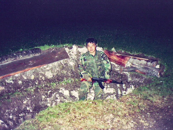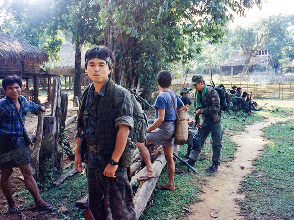 ミャンマーで行軍中、味方であるカレン族の村に立ち寄る。こうして民間人に味方のプレゼンス(存在感)を示すのも重要な仕事のひとつだった(筆者提供)