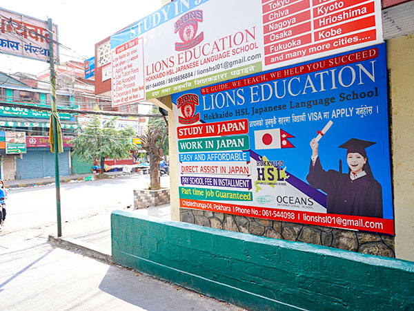 中心部に向かうと、とにかく目立つのは出稼ぎあっせん業者の看板。カトマンズでもよく見たが、ポカラも同様だ。欧米や日本への留学をアレンジする語学学校、中東への労働者を募るオフィスの看板が、ビルの外壁にびっしりと並ぶ。中には、すし職人の養成学校まであった。日本ではなくフランスのすし店に派遣されるという。こうした看板が、若者が集うショッピングモール近辺にも踊る。どこもかしこも海外への誘いであふれているのだ。