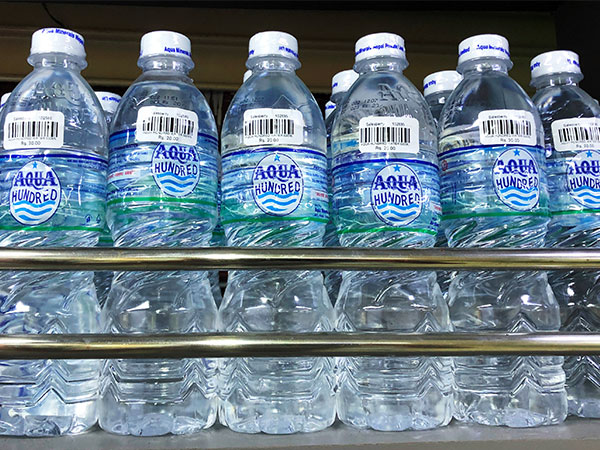 スーパーマーケットに並ぶミネラルウオーター(500ミリリットル)は、1本20ルピー(筆者提供)