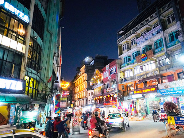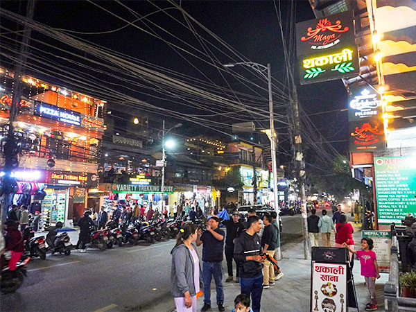 ネオンがきらびやかな夜のカトマンズのタメル地区。観光客で賑わう(筆者提供)
