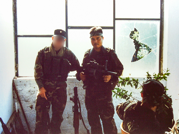 ボスニア時代。市街地や森林での戦闘を経験し、人脈も一気に広がった。「この後、各地に散らばっていった戦友たちから世界各地の戦争・紛争やリクルートの情報も集まるようになりました」と高部氏(筆者提供)
