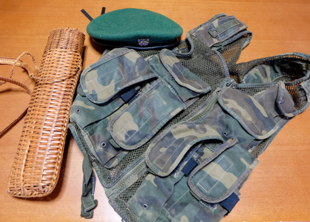 現役時の思い出の品々。カレン兵が作った竹細工のナタ入れ(左)、フランス外人部隊の友人がくれたベレー帽(上)、ボスニアで支給されたベスト(右)(NNA撮影)