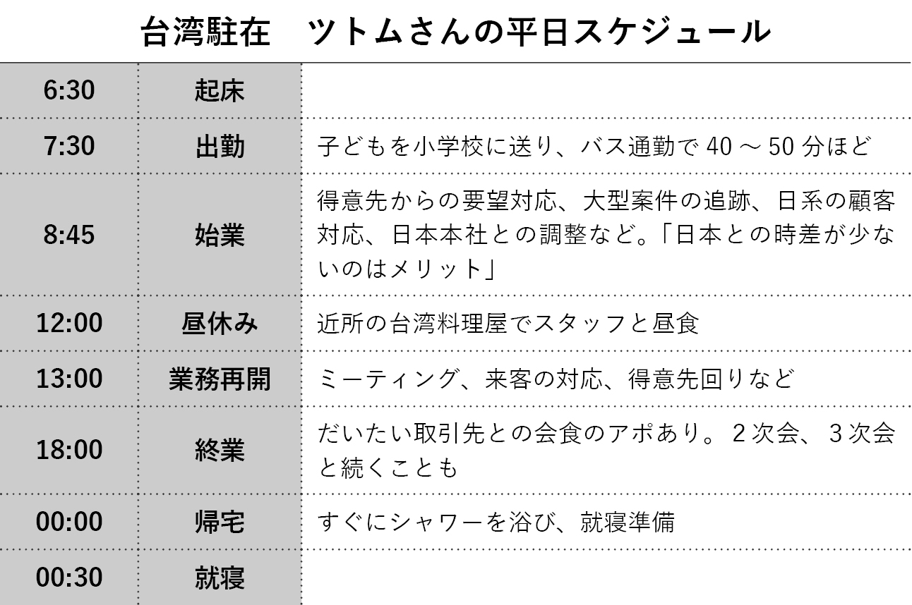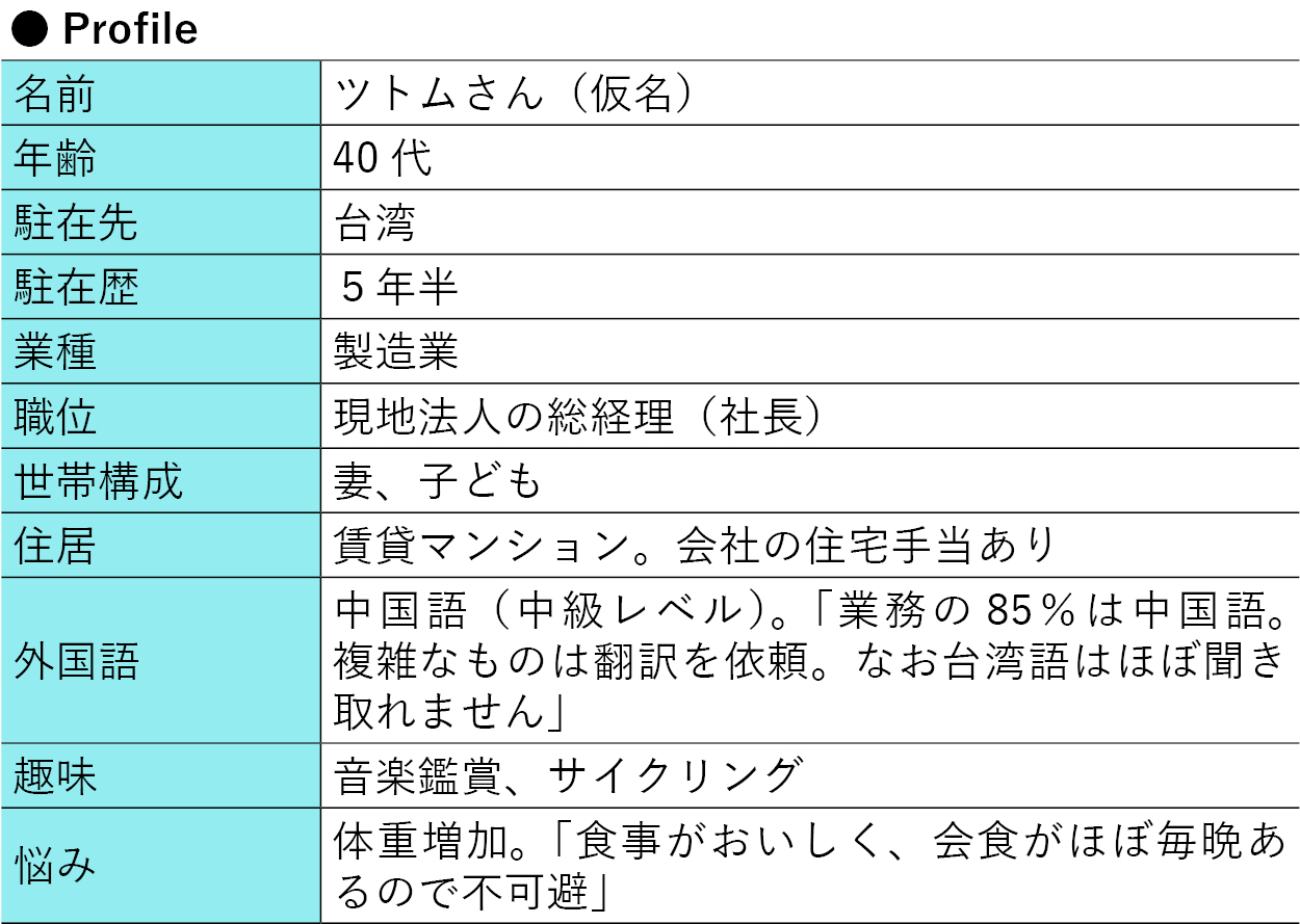 専門機器メーカーで働くツトムさんが、台湾法人の社長に就任したのは5年半前。それまでは営業畑一筋で、海外で働くのは初。「特別な仕事を任されたと喜ぶ一方、経営は未経験で心配だった」と振り返る。「郷に入れば郷に従え」を信念に、台湾での駐在生活を乗り切ってきたツトムさんにマイルールを聞いた。