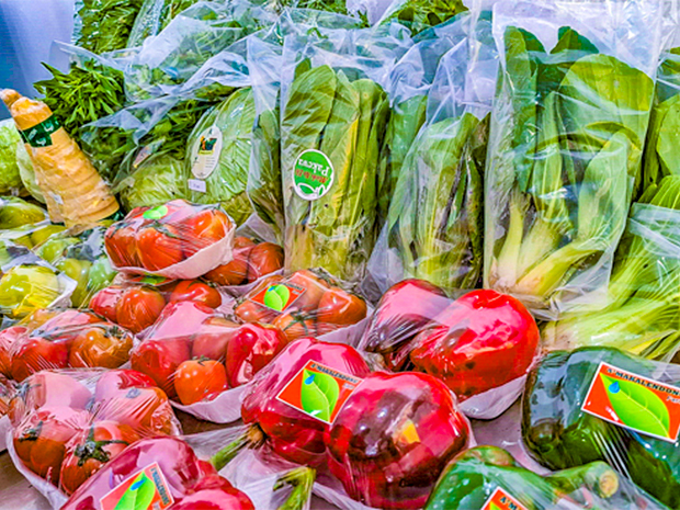 道の駅で販売している新鮮なオーガニック野菜。「女性客に手に取ってもらえるように、清潔なパッケージ包装を心がけた」と関係者=5月、インドネシア・北スラウェシ州トモホン市(NNA撮影)