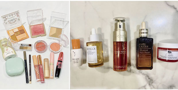 NNAの調査に応じた、タイ人女性の愛用コスメの一部。メーキャップ(左)は80~300バーツとプチプラ系。一方スキンケア(右)は「クラランス」といった欧米系の高級ブランド品が目立つ=バンコク(NNA撮影)