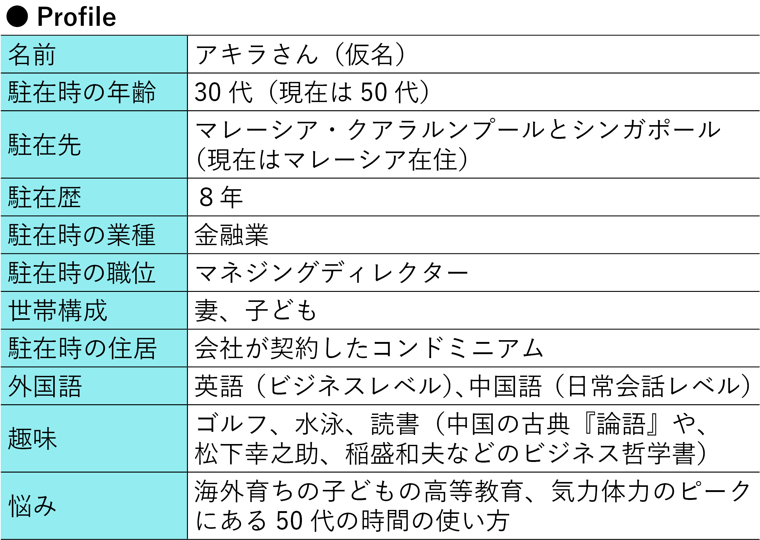 シンガポールで起業し、日本企業と現地企業のビジネス仲介をするコンサルティング事業を行っているアキラさん(仮名)。もともとは駐在員で、マレーシアとシンガポールにそれぞれ4年赴任した経験を持つ。当時の生活や、独立した経験から得たマイルールを、駐在員の「先輩」という立場で語ってもらった。
