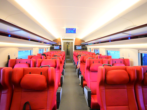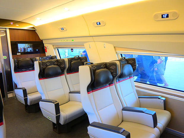 試乗時の車両は8両編成。座席のグレードは、VIP(18席)、ファーストクラス(28席)のほか、プレミアムエコノミークラスがある。プレミアムエコノミークラスは2列と3列シートで座席数は計555席。2列シートに1カ所、3列シートに2カ所、充電用コンセントが設置されている。