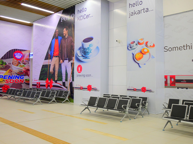 ハリム駅の待合室。麺専門店やコーヒーショップの開業予定を知らせる看板も=ジャカルタ特別州(NNA撮影)