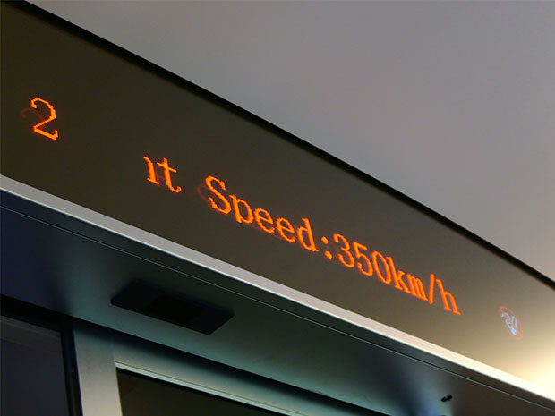 走行速度が、時速350キロメートルに達したことを知らせる車内の電光掲示板(NNA撮影)