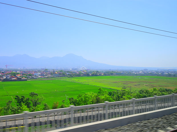 西ジャワ州を走る高速鉄道の車窓。写真中央の三角の建物は、壮大なモスクとして知られる「アル・ジャバール・モスク」=インドネシア・西ジャワ州(NNA撮影)