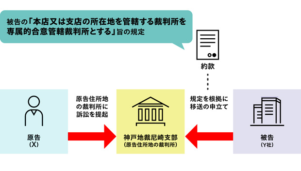 Xが、Y社の行為により損害が生じたとして、神戸地裁尼崎支部に不法行為に基づく損害賠償請求訴訟を提起した。それに対しY社は、約款中に「本店又は支店の所在地を管轄する裁判所を専属的合意管轄裁判所(※)とし、お客様はこのことをあらかじめ了承する」と規定されていたことを根拠に、主位的に支店所在地である東京地裁へ、予備的に本店所在地である名古屋地裁への移送を申し立てた。